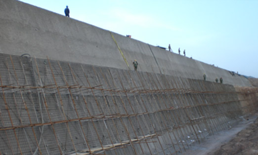 在包裹式坡面加筋土边坡体内预埋锚固钢筋,并在锚固钢筋上挂钢筋网,然后进行喷素混凝土的加筋边坡形式,适用于坡面不宜植草绿化的陡坡加筋工程中。